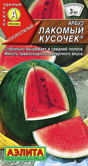 в южных регионах за сезон формирует около 7 порционных арбузов массой до 3,5 кг. В средней полосе рекомендуется ограничить число завязей до 4-5. Мякоть не содержит аллергенов, малосемянная, более нежная, сочная и сладкая, чем у традиционных сортов. Этот арбуз однозначно станет любимым десертом вашей семьи!