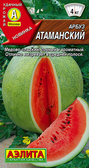 8 руб.Среднеранний сорт с большим потенциалом крупноплодности! От всходов до начала плодоношения 90-95 дней. Растения длинноплетистые, урожайные: масса плодов всредней полосе 2,5-3,5 кг (до 5-6 кг). Плоды-гиганты имеют овальную форму. Мякоть розовая, очень сладкая. Арбузы могут храниться до 30 дней после съема.