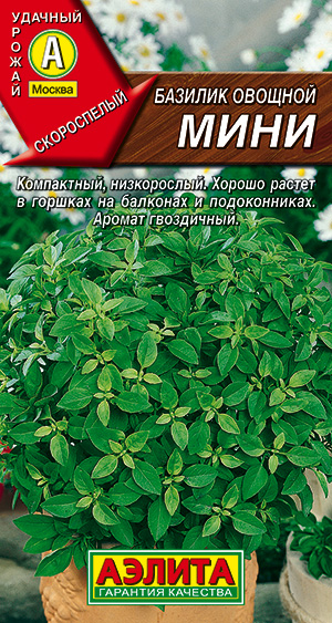 16.95 руб.Скороспелый (60-70 дней от всходов до цветения) сорт. Куст компактный, шаровидный – 20-25 см в диаметре, густооблиственный. Листья мелкие, с сильным гвоздичным ароматом. Листья и молодые побеги в свежем виде используются в качестве салатной зелени и пряно-вкусовой добавки к блюдам домашней кулинарии. Зелень является превосходным натуральным ароматизатором, широко применяется при сезонном консервировании овощей. Растения смотрятся очень декоративно, хорошо растут в горшках на балконах и подоконниках.