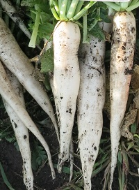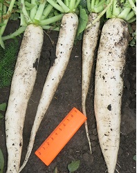 Раннеспелый сорт, от появления всходов до технической спелости корнеплода проходит 50-60 дней. Корнеплоды гладкие, с белой кожурой, длиной 30-60 см. Погружены в почву на 1/3-1/2 длины. Мякоть очень сочная, нежная, белая, сладковатого освежающего вкуса, без резкого редечного привкуса. Масса корнеплода до 1 кг. Урожайность 10-12 кг/м2