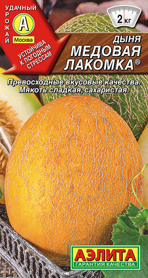 Восхитительно сладкий и ароматный сорт с оранжевой мякотью. Среднеспелый, урожай начинают убирать на 90-100 день после всходов. Плоды массой 1,5-1,7 кг, с тонкой кожицей. Мякоть cочная, тающая, с медовым послевкусием. Отличается повышенным содержанием бета-каротина, что и придает ей такой яркий цвет. Это вкусное и полезное летнее лакомство для детей и взрослых. Также из этой дыни можно приготовить цукаты, варенье и повидло. Сорт устойчив к комплексу заболеваний, хорошо транспортируется.
