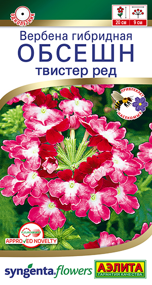 Роскошная серия ароматного летника иностранной селекции. Оттенок «Twister Red» удостоен международной награды за выдающиеся декоративные качества. От большинства известных сортов вербены «Obsession» отличается ранним началом цветения, максимальной его продолжительностью и крупным диаметром соцветий (7-9 см). Растения характеризуются сильным ветвлением и высокой однородностью. Высота кустиков около 15-20 см, ширина – до 30 см. Они прекрасно растут и великолепно смотрятся в садовых цветниках, вазонах, кашпо, балконных контейнерах. -