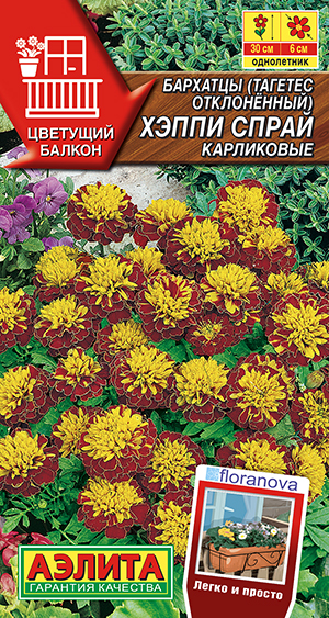 33.05 руб.Красочная серия карликовых бархатцев «Хэппи» (Happy) от английской компании Floranova – то прекрасный выбор для украшения балконов, лоджий и террас. В горшечной культуре астения формируют выровненные и густые кустики высотой и шириной около 20-30 см. Цветение раннее, очень длительное, даже в жарких условиях. Соцветия пышные и крупные, ? 5-6 см, не выгорают на летнем солнце. Уникальный оттенок «Спрай» – это сочетание глубокого шоколадного и насыщенного золотистого цветов. Сорт отличается высокой декоративностью на протяжении сезона и неприхотливостью в уходе.