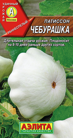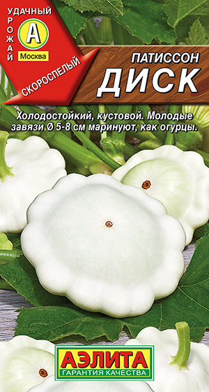6.8 руб.Надежный среднеспелый сорт. От всходов до начала плодоношения 55-65 дней. Растения кустовые, короткоплетистые. Плоды – белые «тарелочки» массой 300-500 г (в биологической спелости). Молодые завязи ? 5-8 см используют для цельноплодного консервирования, плоды более крупные – так же, как кабачки. Урожайность с куста – около 3 кг.