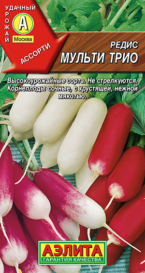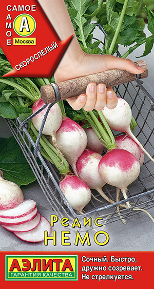 8.5 руб.Раннеспелый крупноплодный сорт для о/г и теплиц. Устойчив к цветушности, дружно отдает урожай на 18-25 день от всходов. Корнеплоды массой до 30-40 г с белой и бело-розовой сочной плотной мякотью пикантного остро-сладкого вкуса. Они долго не дряблеют и могут храниться в холодильнике до 3 недель. Урожайность 3,0-3,5 кг/м2.