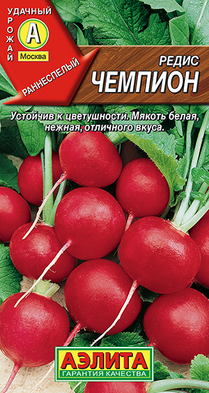 17.45 руб.Неприхотливый сорт-спринтер. Раннеспелый, формирует урожай за 18-22 дня от всходов. Рекомендуется для открытого грунта, парников, пленочных тоннелей и теплиц. Розетка листьев прямостоячая. Корнеплод округлый, с выпуклой головкой. Масса товарного корнеплода 20-25 г. Мякоть белая, плотная, сочная, хрустящая, в меру острая и чуть сладковатая. Корнеплоды осеннего урожая отличаются большей сладостью. Молодые листочки весеннего урожая можно использовать в салатах и окрошках. Урожайность: 1,8-2 кг/м2.