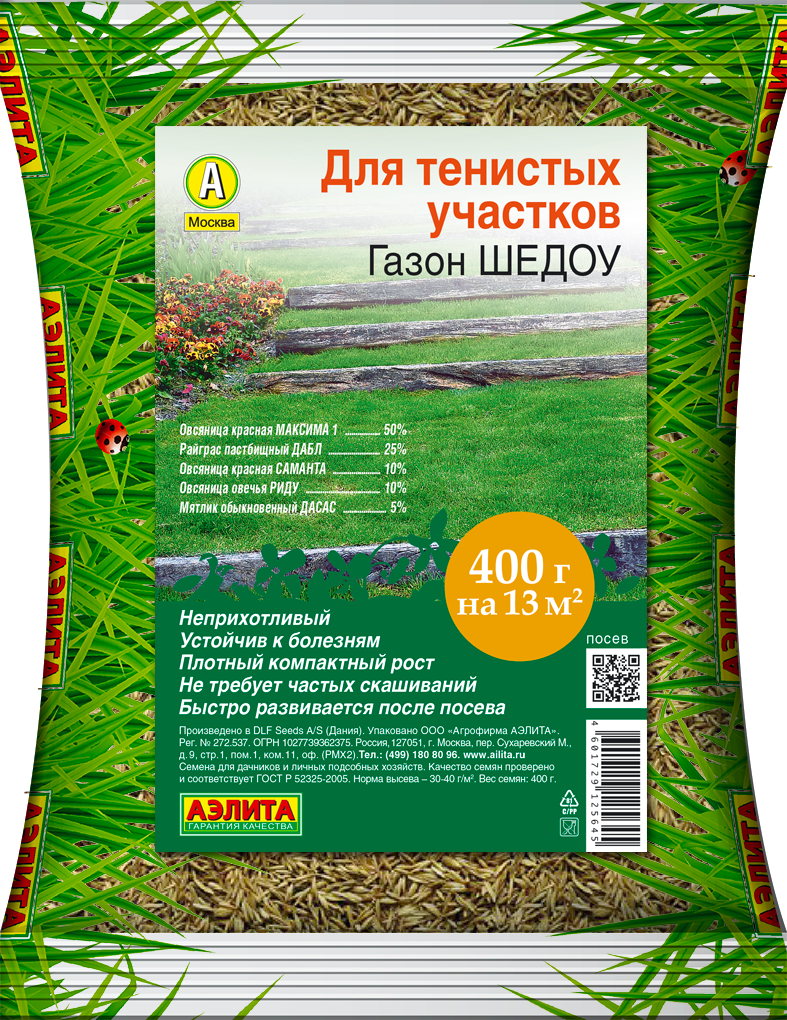 395 руб.Предназначена для создания зеленых покрытий в условиях недостаточного освещения. При соблюдении агротехники озеленять и благоустраивать можно как сухие тенистые участки, так и влажные. Быстро развивается после посева. Получаемый газон отличается неприхотливостью, насыщенным изумрудно-зеленым цветом и устойчивостью к грибковым заболеваниям. В тени не рекомендуется подстригать газон слишком низко.