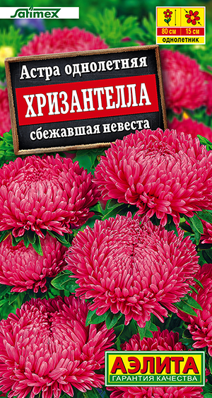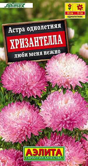 Настроение, воплощенное в цветке! Профессиональная серия однолетних астр для срезки «Хризантелла» – результат успешной селекции компании Satimex QUEDLINBURG GmbH. Окраски представлены в основном редкими и необычными для астр пастельными оттенками, сочетая качества и стойкость хризантемы и очарование астры. Соцветия плотные, великолепной формы и впечатляющего размера – до 12-15 см в диаметре! Жесткие лепестки загнуты к центру, не повреждаются ливнями и ветром. Растения мощные, высотой около 60-80 см. Цветоносные побеги крепкие и устойчивые. На одном кусте образуется до 10-15 цветков. Букет из таких удивительных астр сохраняет свежесть в вазе с водой гораздо дольше большинства известных срезочных сортов.