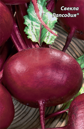 Свекла Рапсодия® – сорт раннеспелый, неприхотливый, устойчив к образованию цветоносов. Вегетационный период от массовых всходов до уборки урожая 80-100 дней. Формирует темно-красные корнеплоды плоско-округлой формы. Мякоть темно-красная, сочная, нежная. Корнеплоды массой 230-370 г, пригодны для всех видов переработки.